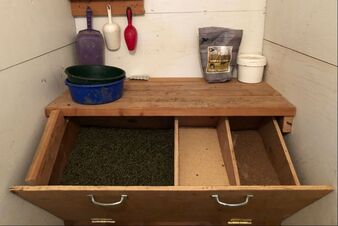 This is a picture of my feed room. I tend to favor high protein supplements such as alfalfa pellets, soy bean and coconut shreds.