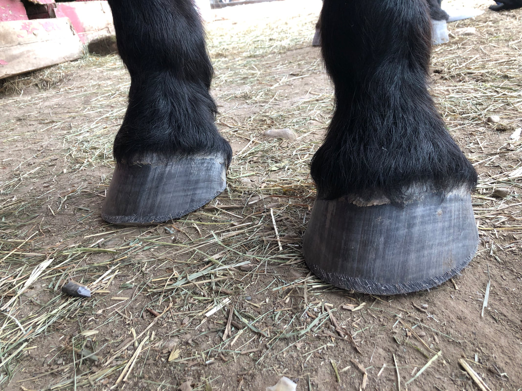 Feed trial #3 is a group of horses that don't have any major outward issues with their hooves. They don't have the dry brittle hoof texture, and have a relatively healthy looking hair coat, however they do show a slight amount of muscle wastage in the top line. They have been fed a hay source high in alfalfa, and have been supplemented with a free choice mineral supplement for approximately 8 weeks. Results have varied among the horses but the ones with more muscle wastage have have improved slightly, while the ones with a lesser degree of muscle wastage have stayed the same. One area where this herd has improved is the incidence of minor thrush in the hoof. In spite of the wet weather due to the season change, these horses hooves appear to be more resistant to developing thrush and have overall healthier frogs then what I was previously seeing in their hooves.