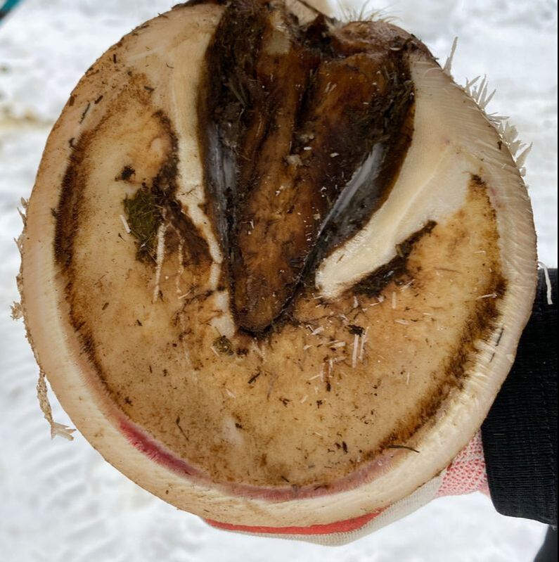 What if it's more serious? If you are seeing this bruising when the ground is not frozen and hard, or it is present in both front hooves or all four hooves equally, it could be a sign of repeated toe first landings or even laminitis (caused by metabolic conditions).