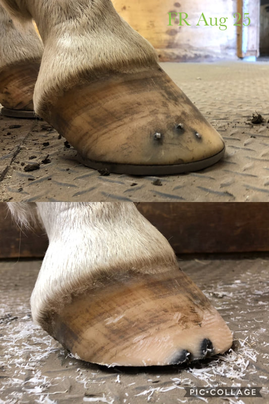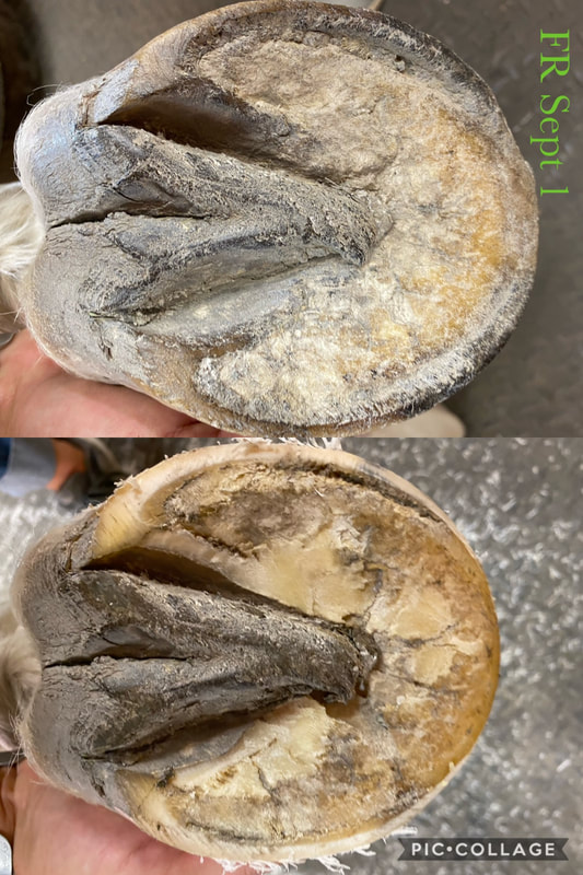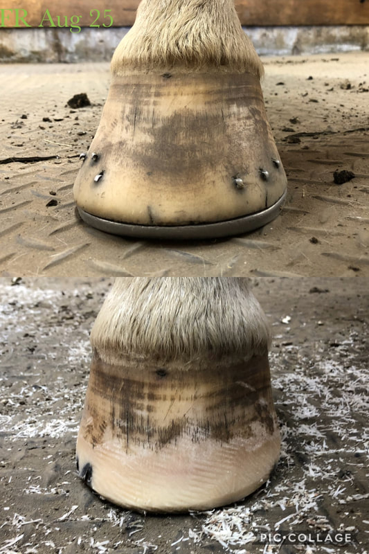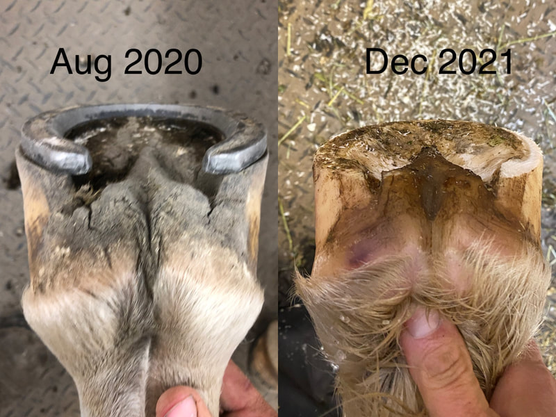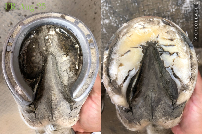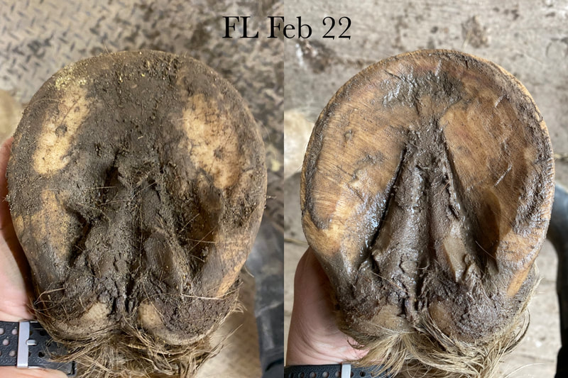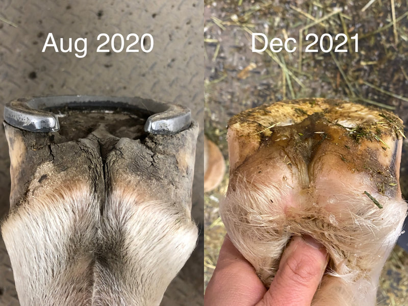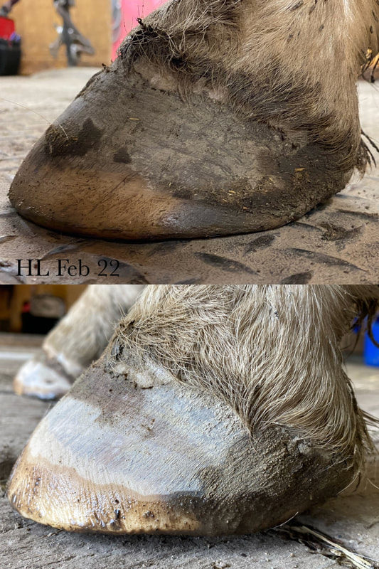 Even though I was watching his soundness and comfort improve I was feeling a bit discouraged with the progress of his hooves until I put these pictures from the beginning of his journey along side the current hoof pictures. I can see that the overall angle of the hooves has changed dramatically and the heel is much farther back underneath the hoof. Also the entire back of the hoof has changed. The frog is wider, but the heel bulbs are also wider and more "full", with a much stronger digital cushion under there.