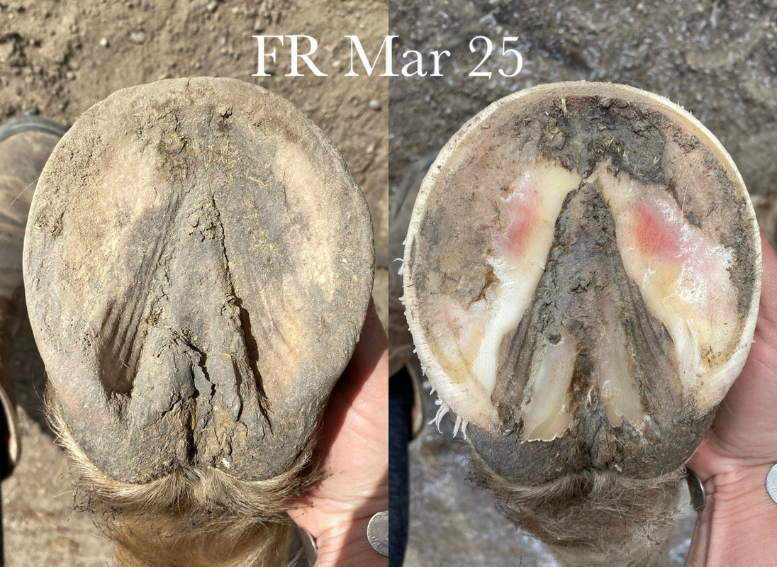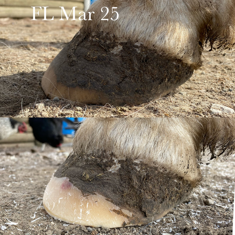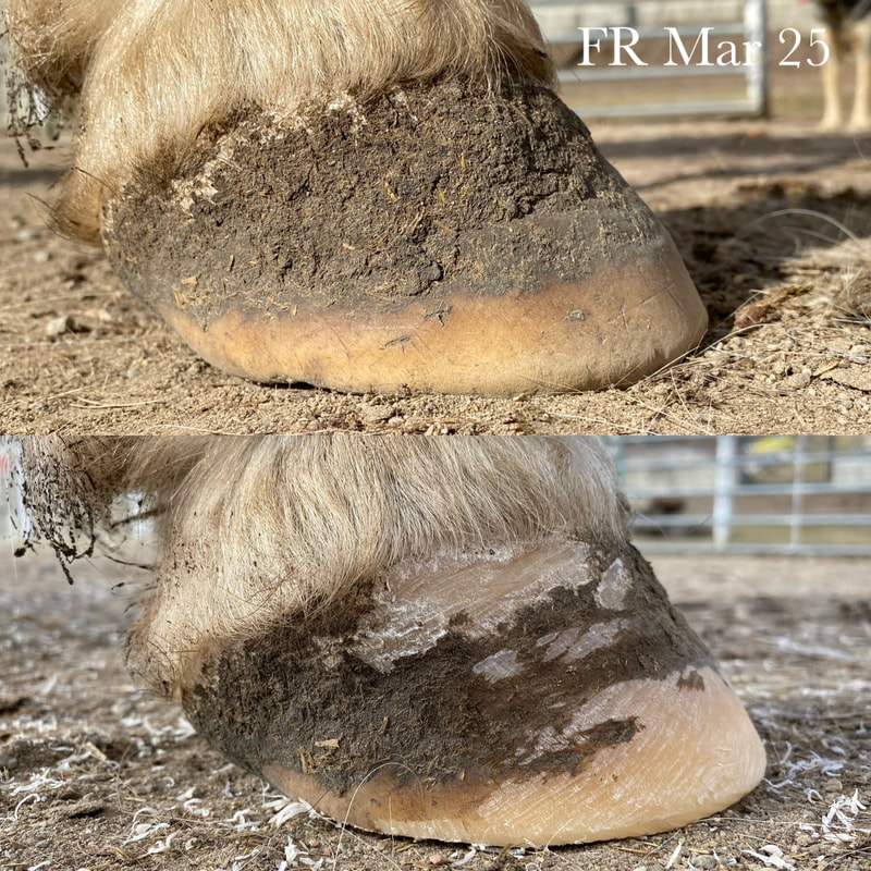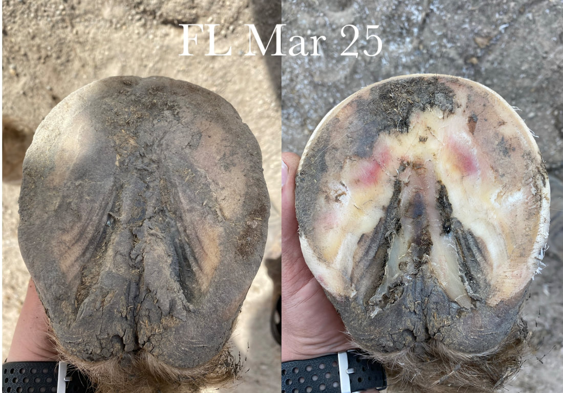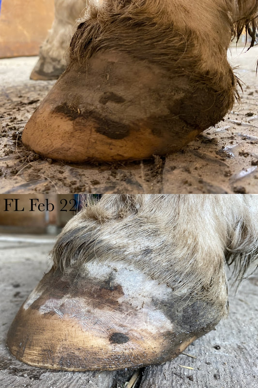 Even though I was watching his soundness and comfort improve I was feeling a bit discouraged with the progress of his hooves until I put these pictures from the beginning of his journey along side the current hoof pictures. I can see that the overall angle of the hooves has changed dramatically and the heel is much farther back underneath the hoof. Also the entire back of the hoof has changed. The frog is wider, but the heel bulbs are also wider and more "full", with a much stronger digital cushion under there.