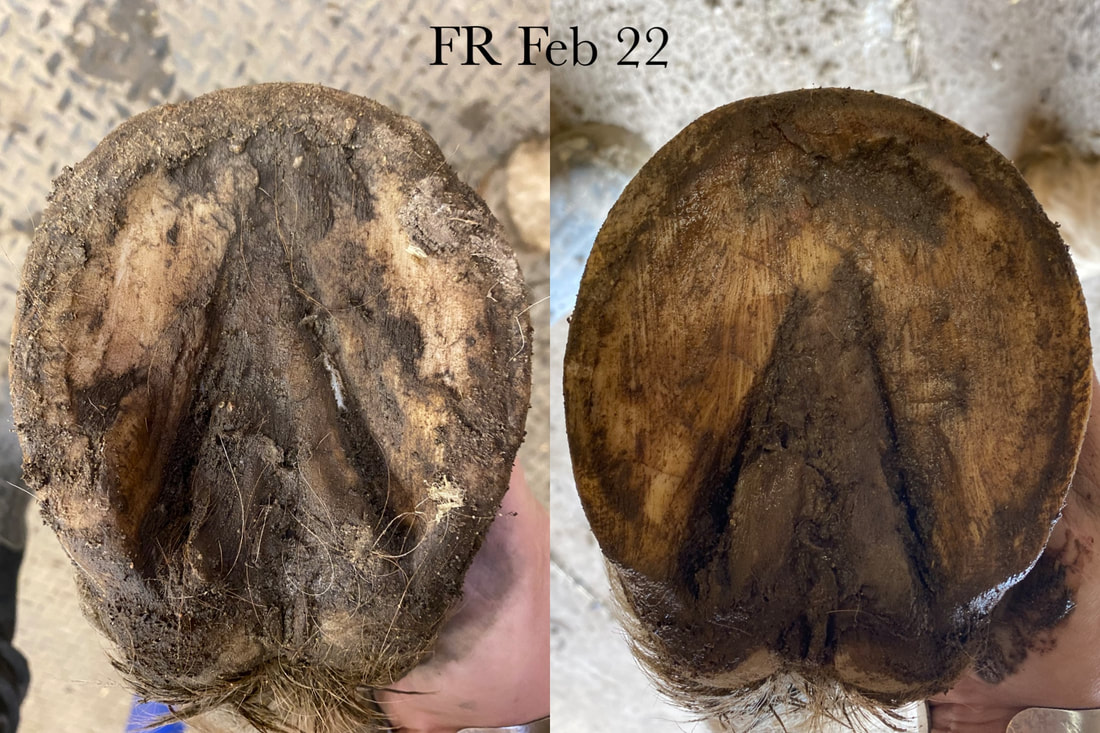 Watching Flash improve has been very emotional. He has gone from a very shut down horse to an in your pocket and really friendly guy. He is a favorite among the youth that I work with and has been sound enough to use in the program since the August 2021. He spent most of the summer in Duplo Classics glued on with the 11 finger tab system. This product packed with dental impression material both protected and stimulated the back of his hooves and caused his frog to grow in wider and thicker, as a result of the improving health of the digital cushion.