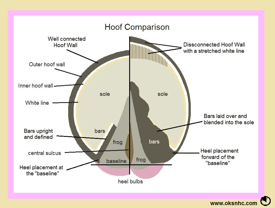 Bar Definition - The purpose of the bars are to support the back of the hoof upon impact. The bar is an extension of the hoof wall as it wraps around from the heel surface. The bars should run at a downward slope from the heel to the mid-point of the frog. The bar should also be upright and defined, not laid over or blended into the sole. When bars invade the sole it can cause many different issues, the most common are: sensitivity on hard ground and reoccurring abscessing. In rare cases embedded bar can also cause navicular like symptoms.