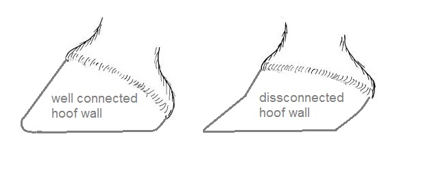 Wall Connection - A well connected hoof wall supports the coffin bone and allows the hoof to function as intended. The hoof wall grows downward from the coronet to the ground and should not flare or deviate in angle as it descends. A hoof wall that changes its angle part way down the hoof will have a poor connection and decreased concavity in the sole. A disconnected wall can lead to the coffin bone sinking down into the hoof capsule causing inflammation in the sole resulting in sensitive hooves.