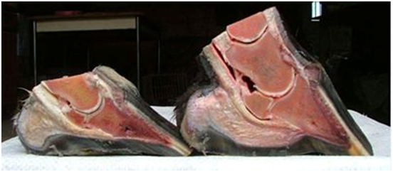 Healthy navicular bones and navicular bones with permanent damage Published in Saddle Up Magazine September 2015 Most horse owners cringe at hearing the words Navicular Syndrome. In the past it has often meant expensive corrective shoeing and just trying to keep your horse sound for one more season, inevitably resulting in putting them down. Unfortunately Navicular Syndrome is one of the hardest subjects for a farrier/trimmer to research. It seems that every old text contradicts the next, and every person you talk to has a different understanding of the condition. The good news is that tons of new research is being done, and hopefully the equine world will soon have a better understanding that the best way to treat Navicular Syndrome is to prevent it in the first place, and that it is easy to do so. One of the doctors at the forefront of Navicular research is Dr. Robert Bowker of Michigan State University. I had the pleasure of meeting Dr. Bowker at the 2015 Equine Education Summit hosted by Horse Council BC this past spring. Dr. Bowker states that he has identified a heel first landing as the most important element of hoof function and more importantly hoof development. He has determined that as the hoof impacts the ground heel first, the hoof expands both laterally and from the back to the front, and the concave sole descends lower to the ground, thus dramatically increasing the volume of the hoof capsule. This sudden increase in volume creates a vacuum, which pulls blood into the hoof capsule. This pull of blood not only nourishes the living tissues in the hoof, but acts as a very important hydraulic shock absorber. It has been documented over the years that some horses with navicular bone changes are perfectly sound, while others without bone damage can show severe lameness in the rear of the hoof. This is confusing though as it has long been taught in the veterinary and farrier communities that the bone damage happened first and the pain associated with Navicular Syndrome was caused by the deep digital flexor tendon sliding over the rough surface of the damaged navicular bone. Dr. James R. Rooney of the American College of Veterinarian Pathologists specializes in post mortem studies of horses. In thousands of dead horses he has examined, Dr. Rooney found that the fibrocartilages surrounding the flexor tendon and navicular bone were always damaged if bone deterioration was present. He has not found one single case where the bone was damaged and the fibrocartilage was not. He has however found cases where the bone was not yet deteriorated and yet the fibrocartilage had started to break down. He has learned that the order in which damage occurs is: first the fibrocartilages surrounding the navicular bone, second the fibrocartilages surrounding the deep digital flexor tendon, third the flexor tendon itself, and finally the navicular bone itself is damaged by the rough surface of the damaged flexor tendon. Simulating a toe first landing with cadaver horse legs in test machines, Dr. Rooney was able to simulate this exact process of deterioration, proving the order in which tissues were damaged leading to Navicular Syndrome. The main structure in the front half of the hoof is the coffin bone. The sole and hoof wall are attached to it via the lamina. The digital cushion and the lateral cartilages form the rear half of the hoof. It is the rear half of the hoof that is responsible for dissipating the impact energy of movement. The front of the hoof has no impact absorbing structures, they are all fairly rigid. The digital cushion at birth is made up of primarily fat and is filled with nerves. As the foal moves the pressure and release of the frog causes fibrocartilage to grow from the front of the digital cushion and spread toward the back. By the time the horse has grown to an adult the digital cushion should have transformed into a mass of fibrocartilage. This fibrocartilage is responsible for protecting and cushioning the nerves as well as dissipating the energy of a heel first landing. The lateral cartilages at birth are tiny, less than 1/16th of an inch thick, and don’t extend to the underside of the frog and digital cushion yet. As the foal grows, with movement, flexion, and the expansion and contraction of the hoof mechanism the lateral cartilages grow. They should eventually extend to create a floor underneath the frog and digital cushion and should have developed to about an inch thick. So why are most horse’s uncomfortable landing heel first? Because in domestication we tend to keep our foals on soft ground. Deeply bedding the stalls that restricts their movement, and keeping them on soft terrain when they are turned out. The soft ground inhibits the flexion, expansion and contract and negates the hoof mechanism as it was designed to work. This results in very commonly, adult horses with lateral cartilages as thin as 1/8th of an inch thick instead of the inch they should be, and with digital cushions that are underdeveloped, thin and weak. Dr. Bowker has also found that bone loss associated with Navicular Syndrome can also be attributed to a lack of natural pressure in the navicular region of the hoof. He specifically blames peripheral loading i.e. shoeing the hoof to remove sole pressure or allowing the hoof wall to grow too long so that the sole, frog, and bars of the hoof cannot share in the weight baring pressures of movement as they were designed.