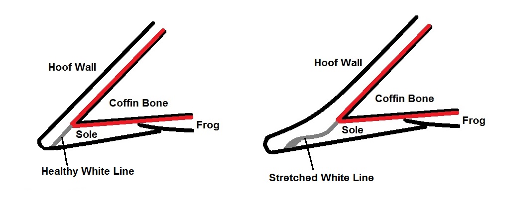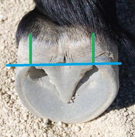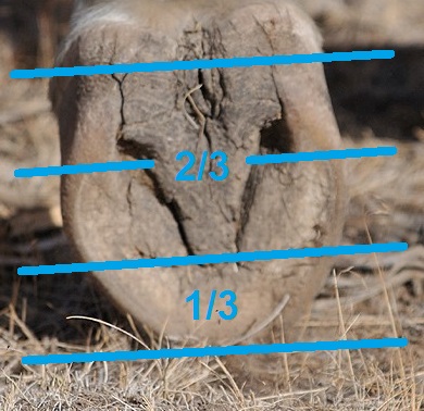 The fulcrum is simply the widest part on the bottom of the hoof. It is almost always about ¾ inch behind the apex of the frog occurring at the mid-point of where the coffin bone sits inside the hoof and is not usually distorted by flaring or stretched lamina. We measure the fulcrum from the golden line on one side to the golden line on the other side, not from wall to wall. If the measurement was 4 ½ inches, we would then measure from our baseline forward 4 ½ inches and mark where our golden line should be at the toe. In a balanced hoof that has been trimmed regularly and correctly, this mark will line up with the golden line at the toe. I just want to reiterate that this is also not a cut line, we still have to add our wall thickness to determine where the cut line will be. We also must “read” the hooves’ wear patterns and toe callous before deciding where to cut. Now that we have determined the circumference of the hoof we can establish the 2/3 to 1/3 balance. The baseline to the apex of the frog should be 2/3 of the overall hoof length. Frogs can get stretched forward into the sole’s 1/3 and occasionally need to be trimmed back. This measurement will determine if the frog has migrated forward. However all of our measurements to this point would be inaccurate if we had measured our baseline wrong, so caution must be taken to measure correctly and confirm we are right by reading” the clues and wear marks in the hoof.